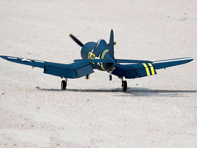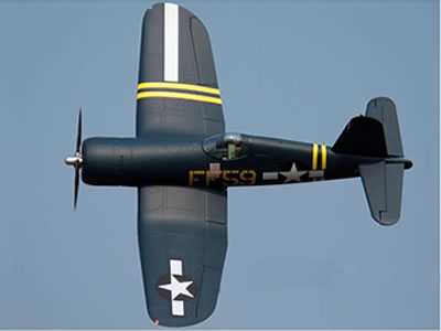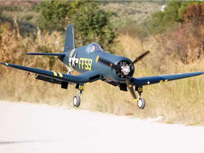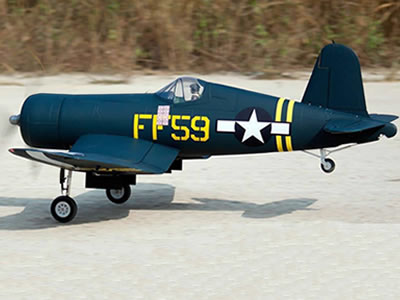 Takeoff is very stable without the need for flaps. The F4U can execute a wide range of maneuvers, including all scale maneuvers and additional non-scale acrobatics. Its aluminum suspension main struts and tall wheels provide confidence when operating on grass runways. All three landing gear are retractable, and the mains even feature three panel sequenced molded plastic gear doors for ultimate realism.