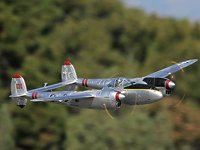 The stock PNP version is equipped with two 3748 brushless outrunner motors and two 12x7 3-blade counter-rotating propellers for the perfect scale appearance. With the recommended 4S 14.8v 5000mAh (one battery per side or a single battery with your series adapter), the P-38 boasts sufficient power for large consecutive loops and a level top speed of 81mph.