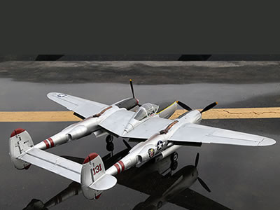 This P-38 was designed for easy operation. Its outer wings disassemble with four screws for convenient transportation and allowing the aircraft to sit on all three wheels without the outer wings attached. The horizontal stabilizer can also be removed with screws for maintenance or replacement. FlightLineRC's P-38 Lightning features durable electronic retractable landing gear, five sequenced servo driven landing gear doors, day-bright LEDs, machine gun details, plastic nose cone and cowls, four flaps, accurate canopy and nacelle shape, and other scale details. The correct wing dihedral and other scale profiles were precisely modeled to produce an accurate P-38 shape which honors this historic warbird. Each rudder is directly controlled by its own servo. The cockpit layout accommodates a wide range of 4S 14.8v Li-Po batteries with ample space for electronics, all accessible under the long magnetic hatch cover which spans almost the entire length of the pilot's nacelle. To ensure a high degree of structural rigidity, the entire model was designed around a special framework of carbon rods and reinforcement points. This framework strengthens the aircraft during high speed maneuvers, while still providing a gentle and forgiving flying behavior.